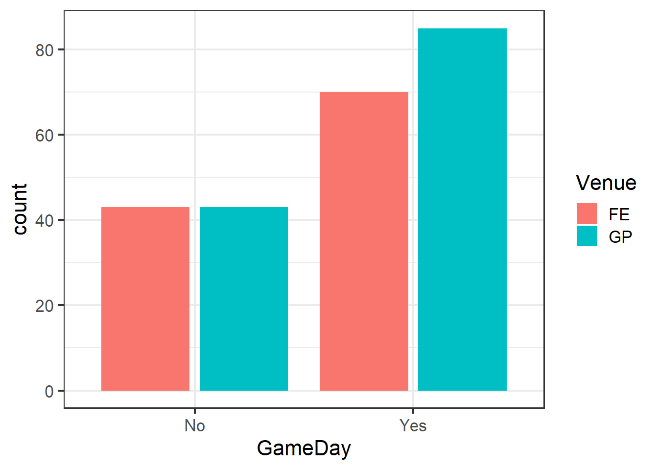 But first, let’s look at the summary count table of arrests by game day or not across venues: