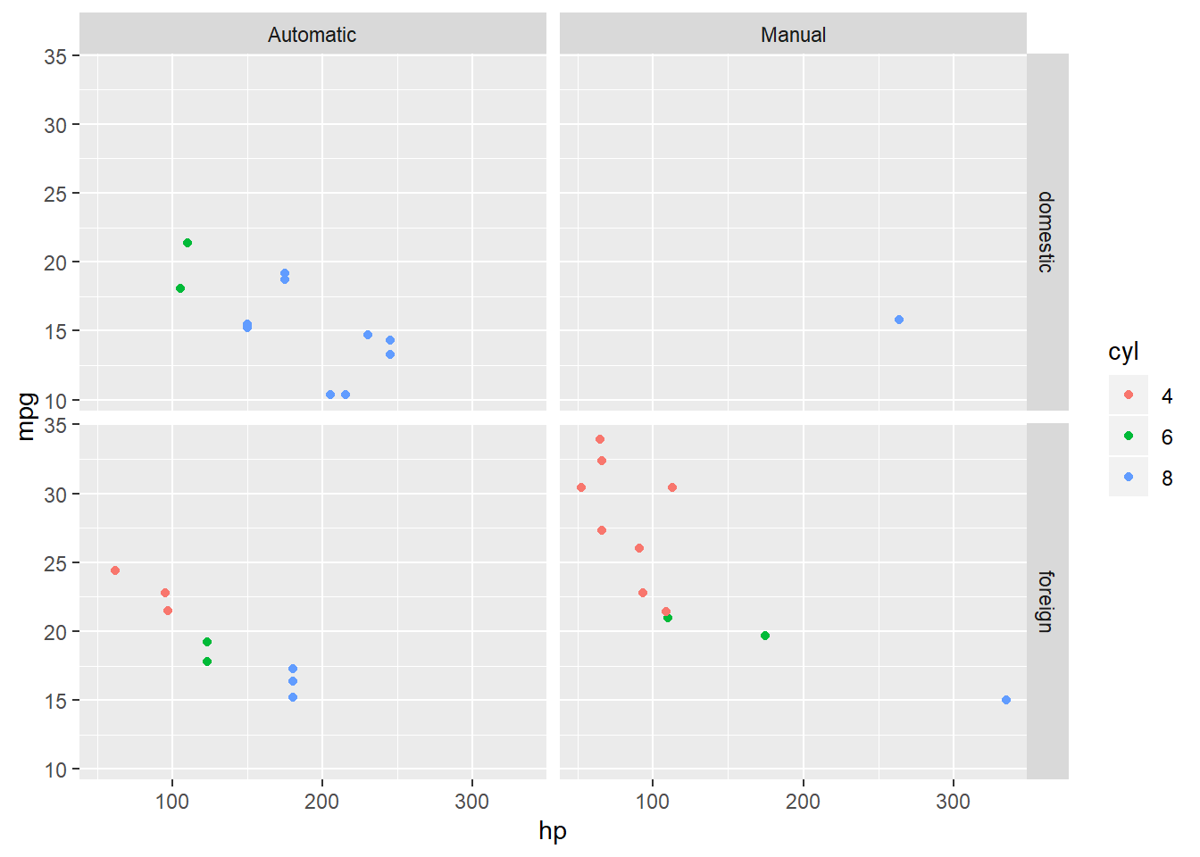 With panes and colors taking care of categorical variables, we can add a continuous variable, wt, to show the mass of cars via the relative size of the plotted points; i.e. larger points are heavier cars: